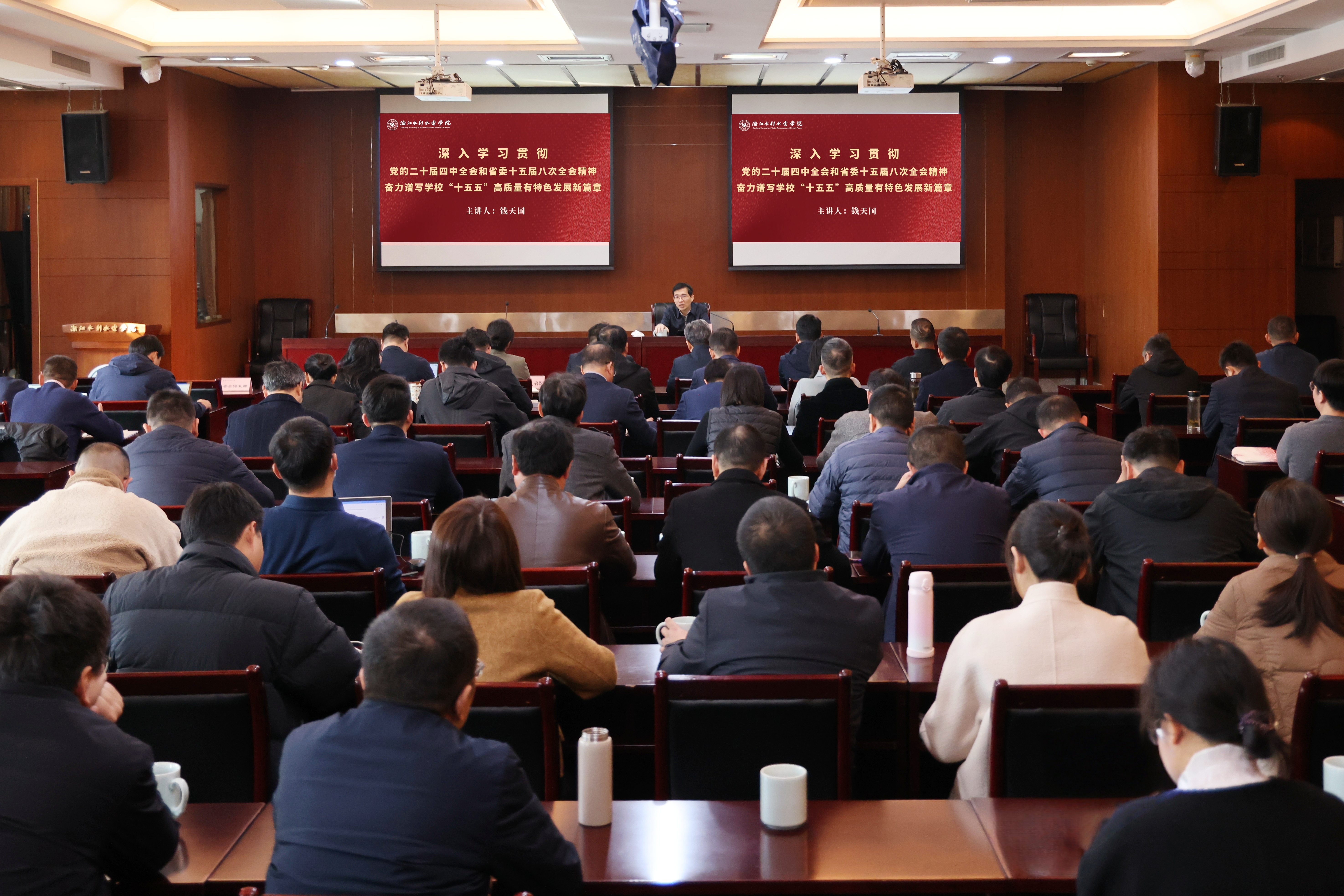 钱天国通过与“十四五”规划的对比分析,解读了“十五五”时期我国及浙江经济社会发展的指导思想、遵循的原则和基本要求、主要目标、战略任务和重大举措,以及党的二十届四中全会和省委十五届八次全会关于教育改革发展的新部署新要求。他指出,要把学习贯彻党的二十届四中全会精神与深入贯彻习近平总书记考察浙江重要讲话精神、认真落实省委十五届八次全会部署要求结合起来,在浙江未来五年“推动高质量发展建设共同富裕示范区取得决定性进展、率先呈现基本实现社会主义现代化的生动图景”中,找准水院定位、展现水院担当,坚定不移沿着“贺信精神”指引的方向奋勇前进。