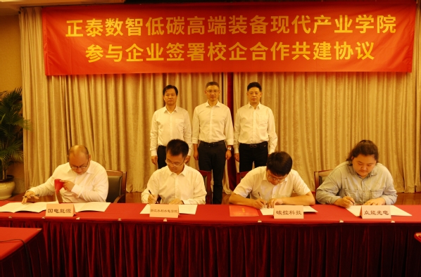 李政辉代表学校与杭州众能光电科技有限公司、碳控科技(杭州)有限公司、杭州国电能源环境设计研究院签署合作共建协议。陈光亭、李丰和黄永忠见证签约。陈光亭代表学校接受正泰中自公司捐赠。电气工程学院院长罗云霞介绍了现代产业学院建设现状与发展规划。